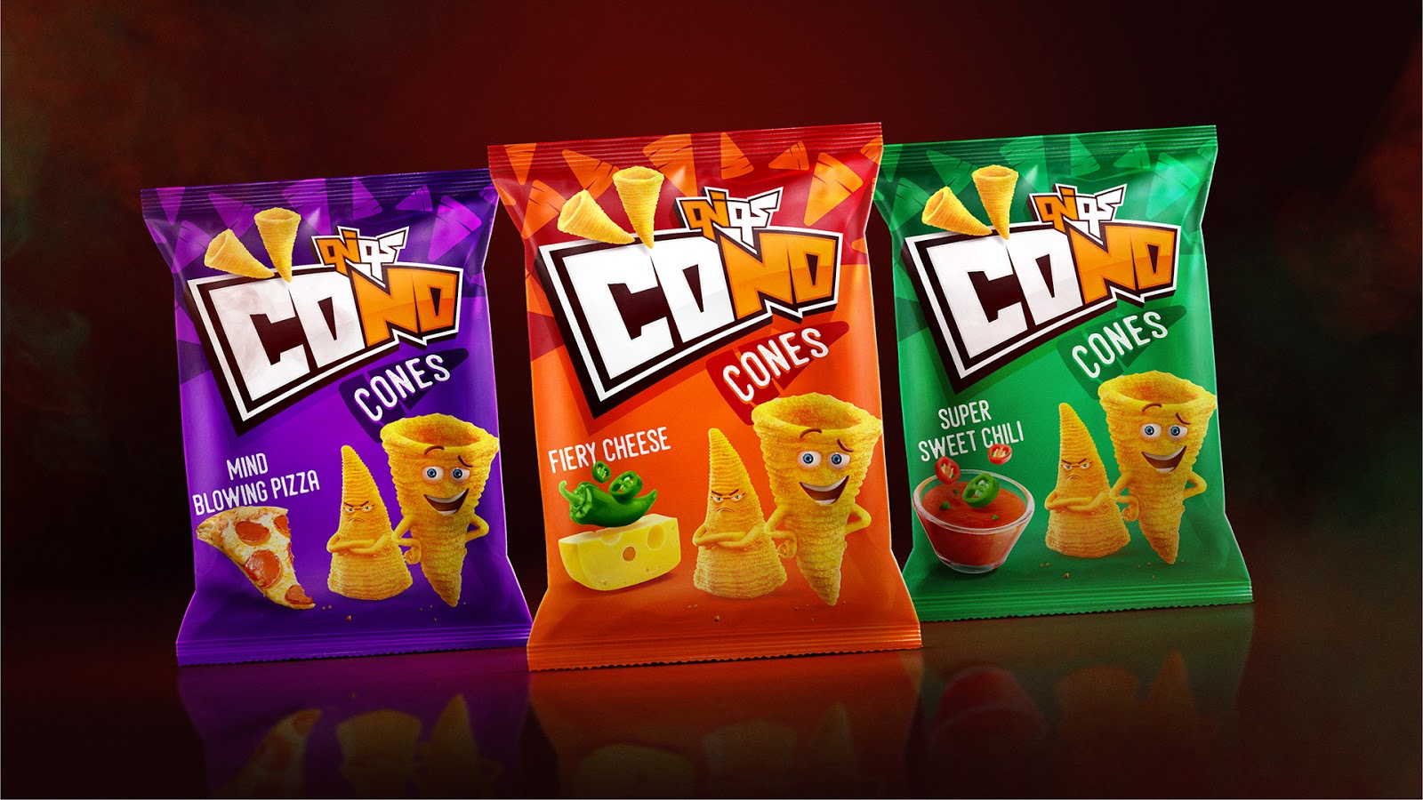 重庆产品创意包装设计-食品包装设计Cono是一种玉米基小吃,曾经存在于市场中,然后消失了。现在该产品又回来了,我们还与现有的Cono Cones一起建立了2个新的变体。我们的目标是进行品牌改造,打乱市场,并传达新改进和开发的Cono产品。 标志和包装的提升之处在于,它们适合年龄更大的新目标受众。而且,现在我们在锥中添加了2种新产品,分别是泡芙和爆米花,要在同一个家族中区分这三种产品存在很大的挑战。